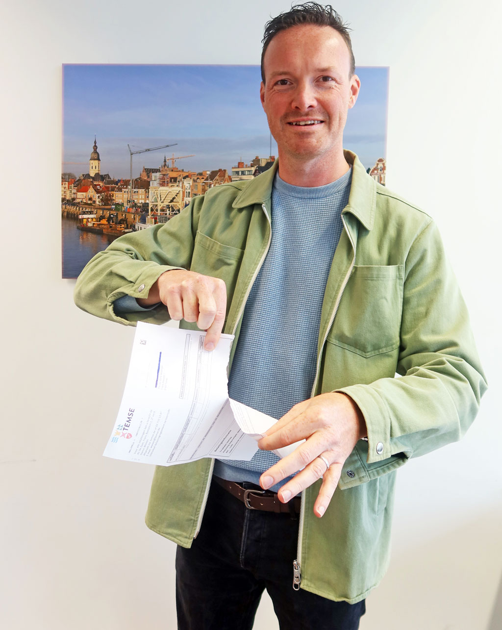 Wie hulp nodig heeft, kan een afspraak maken bij de Digipunten via 03 710 13 44 of Dit e-mailadres wordt beveiligd tegen spambots. JavaScript dient ingeschakeld te zijn om het te bekijken.. (mb, foto: Schepen Bart Van Geyt verscheurt een papieren aanslagbiljet als symbool voor de start van de digitale verzending., © Gemeente Temse)