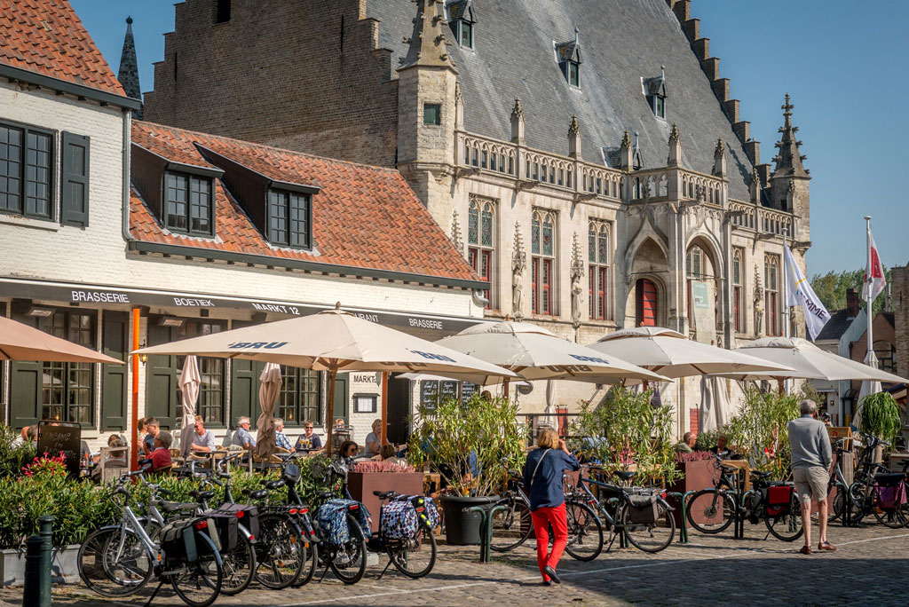 Met de fiets die bij Vist Damme kan gehuurd worden, trekken we er op uit. We peddelen richting Nederlandse grens waar we overzetten met de Kobus. Dit overzetbootje verbindt Hoeke met Lapscheure en wordt in de zomer vaak gebruikt door fietsers en wandelaars die hiermee op een originele manier de Damse Vaart kunnen oversteken. José De Cauwer blijft het herhalen: hoed je voor de hongerklop. Met deze bemoedigende koerswijsheid stallen we onze tweewielige rossen aan Restaurant De Spieghel pal aan het stadhuis. Gastheer Brent en Wim zijn al enkele jaren het sympathieke gezichten van De Spieghel in hartje Damme. Beiden koesteren de typische brasseriesfeer die deze zaak zo kenmerkt: een eeuwenoud decor met veel mezzanine, oude objecten en een opvallende kroonluchter.. Resultaat: de rustige sfeer en de landelijke omgeving garanderen enkele uurtjes stressvrij genieten. Om te keuvelen maar ook –en vooral- om eens te proeven van de authentieke brasseriekeuken met klassiekers als paling, kalfsniertjes Dijonnaise, bouillabaisse of een van de twee aantrekkelijke menu’s. Tijdens winterdagen biedt het haardvuur nostalgische charme en bij goed weer nodigt een heerlijk terras uit voor mooie tafelmomenten met uitzicht op de Markt.