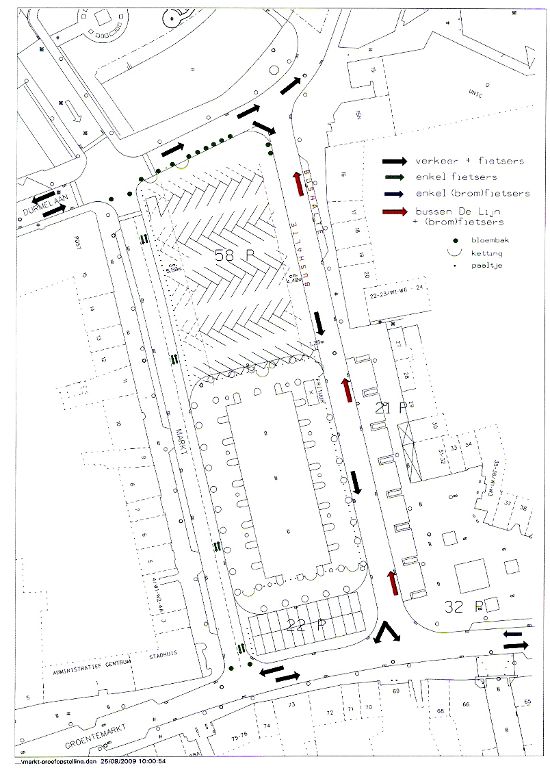 Aan de kant van de Schoolstraat richting kerk zal enkel verkeer toegelaten zijn richting Kerkstraat, met uitzondering voor fietsers en bromfietsers. Vanuit de Kerkstraat mag men dus niet meer met de wagen richting Markt. Op het gedeelte vanaf het stadhuis tot nabij de Schoolstraat is verkeer in beide richtingen toegelaten. Vanaf het postkantoor, richting museum, geldt net als nu éénrichtingsverkeer. Om te vermijden dat chauffeurs de doorsteek van Groentemarkt naar Oude Vismijn als sluipweg gebruiken, zal daar de rijrichting omgedraaid worden van Oude Vismijn naar Groentemarkt.