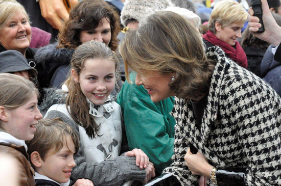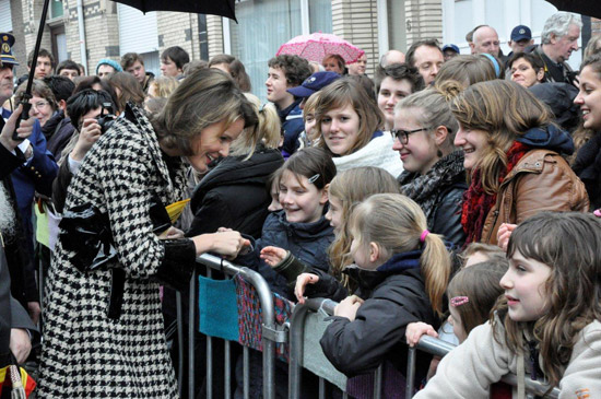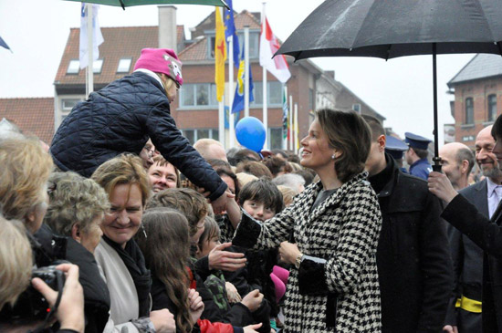 De inwoners van Rupelmonde hadden de oproep om de huizen te bevlaggen goed opgevolgd. En ondanks het miezerige weer, kwam er toch heel wat volk opdagen. Onder aangereikte paraplu's maakten prins Filip en prinses Mathilde tijd voor de aanwezige menigte.