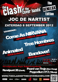 TEMSE. Op zaterdag 8 september vindt in JOC De Nartist in Temse een voorronde plaats van de grootste bandcompetitie 'The Clash of the Cover Bands, The Benelux Edition 2012/2013' voor Regio België/Luxemburg. Vier bands gaan de muzikale strijd met elkaar aan voor een plaats in de regionale finalerondes en worden in twee categorieën beoordeeld: door de vakjury en door het publiek. In beide categorieën plaatsen de winnaars zich direct voor de regiofinale van België/Luxemburg. De vier bands zijn Come As Nirvana uit Rotselaar, Tros Hombres uit Tremelo, Animated uit Lokeren en Bandover! uit het Nederlandse Brunssum.