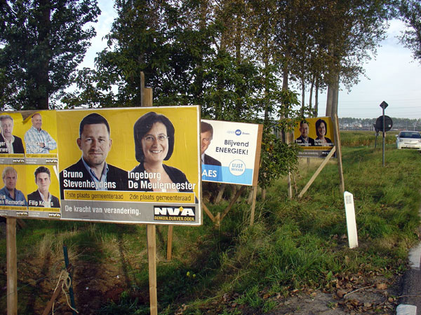 BEVEREN. Twee weken voor de gemeenteraadsverkiezingen stijgt de verkiezingskoorts in Beveren. Waar vroeger concurrenten elkaars verkiezingsaffiche overplakten, worden nu volledige borden voor de andere gezet, zoals hier op een privaat terrein aan de Melseledijk. Het bord van Open VLD-kandidaat Luc Maes wordt volledig onzichtbaar door twee strategisch geplaatste borden van N-VA. (mb)