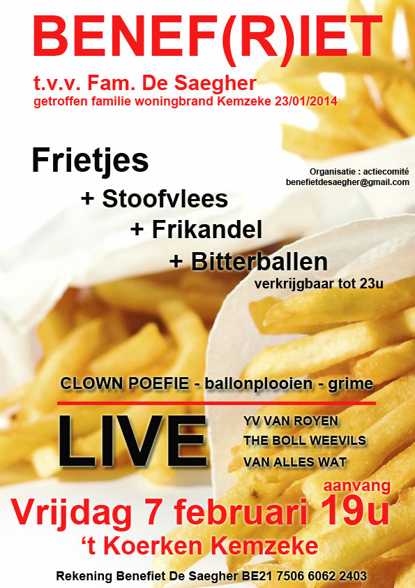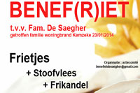 Vrienden van het gezin, gesteund door tal van Kemzeekse verenigingen, organiseren op 7 februari een benefietactie in zaal 't Koerken in de Molenstraat te Kemzeke. Vanaf 19.00 uur zijn er tal van activiteiten voor jong en oud en kan er frietje gestoken worden. Vanaf 20.00 uur zijn er optredens van The Boll Weevils, Yv Van Royen (Dust Laaif), Van Alles Wat en tal van verrassingen.
