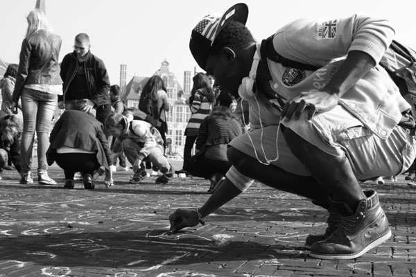 Arman Salahi, masterstudent interieurarchitectuur aan Sint-Lucas Gent, heeft voor zijn recentste opdracht namelijk 'second life in third space' voor deze publieke actie gekozen. De student heeft ongeveer 70 vierkante meter van de markt van Sint-Niklaas met houtskool ingekleurd waardoor hij een zogezegde schoolbord op de grond creëerde.