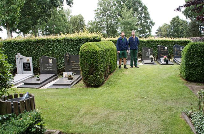 Er wordt nu veel werk gemaakt van het aanplanten van bodembedekkers. En thans is het inzaaien van de paden al op volle gang. Een deel van de begraafplaats is reeds gerealiseerd. De paden waar nu nog grind op ligt, zullen een laag goede grond krijgen en daarop wordt dan het gras gezaaid. Verantwoordelijke Harry Andoorn en zijn assistent Jef weten alvast wat hen nog te doen staat maar ze halen nu al eer van hun werk. Werk dat natuurlijk door de Groendienst wordt uitgetekend. Want alles kadert in het project 'Zonder is Gezonder'