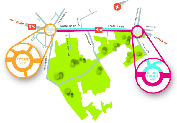 De N70 tussen zijstraat Ster en zijstraat Kwakkelhoekstraat zal de komende 15 maanden een flinke opsmukbeurt krijgen. Twee rotondes aan de Ster en aan de Kwakkelhoekstraat moeten voor een beter overzicht en vlotter verkeer zorgen. Brede, vrijliggende fietspaden langs de beide rotondes en langs de N70 moeten de fietsers meer veiligheid bezorgen, terwijl een middenberm met bomen het geheel aangenamer zullen maken. De N70 oversteken zal dan enkel nog kunnen via verharde zones in de middenberm. Onder het nieuwe wegdek komt een gescheiden rioleringsstelsel.