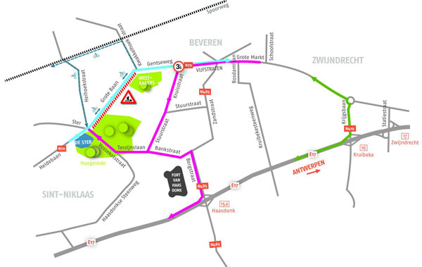 Tijdens de werken kan het verkeer richting Beveren langsheen de werfzone rijden. In de andere richting geldt een omleiding. Verkeer van minder dan 3.5 ton rijdt via de Kruisstraat en de Stuurstraat. Daarna kan er zowel richting Ster als richting complex Haasdonk (E17) gereden worden. Verkeer van meer den 3,5 ton rijdt om via de N70 en de Krijgbaan naar het op- en afrittencomplex van de E17 in Kruibeke.