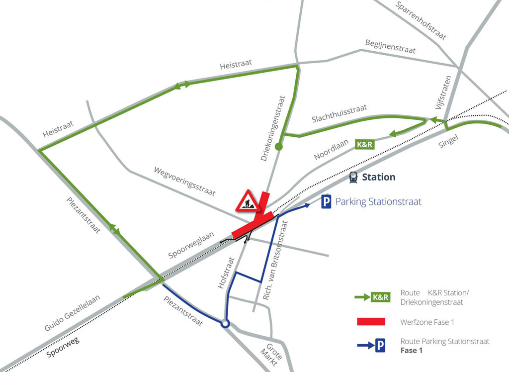 De voorbereidingen waren in maart gestart en zijn klaar. Op dinsdag 18 april start de aannemer de eigenlijke heraanleg aan de kant van de Noordlaan en de Driekoningenstraat, aan de noordzijde van het kruispunt. De verbinding van noord naar zuid en omgekeerd zal niet langer mogelijk zijn. Zo veel mogelijk verkeersbewegingen tussen de Spoorweglaan, Hofstraat en de Kleine Laan blijven open. Er gelden verschillende omleidingen, zowel vanaf afstand als lokaal.