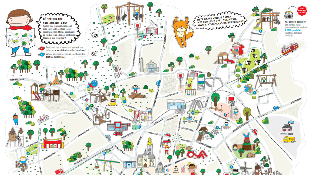 SINT-NIKLAAS.  Vanaf vandaag staat op de website van de stad Sint-Niklaas een digitale speelkaart online. De interactieve kaart toont alle plekken in Sint-Niklaas en haar deelgemeenten waar er speelplekken met speeltoestellen staan. Een gedrukte versie van de kaart wordt via de kleuter- en lagere scholen bedeeld aan kinderen tot 12 jaar. De kaart is versierd met illustraties van de  Sint-Niklase Emma Thyssen.