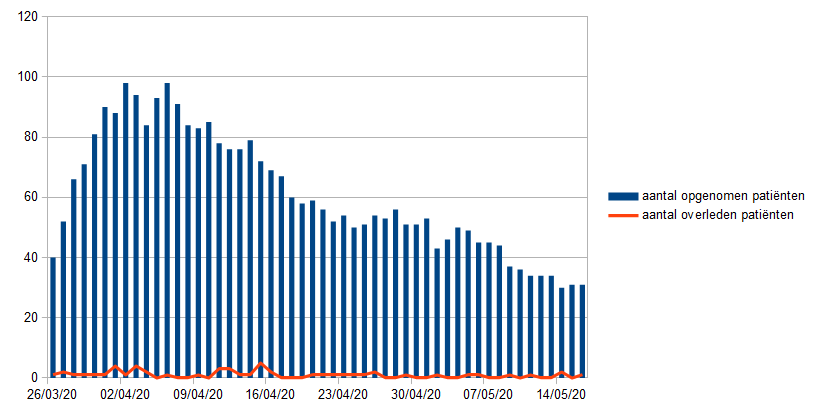 SINT-NIKLAAS/LOKEREN. In AZ Nikolaas en AZ Lokeren zijn 31 patiënten opgenomen die besmet zijn met het covid-19 virus. Vier daarvan worden behandeld op intensieve zorgen. Nog eens 7 personen zijn in het ziekenhuis opgenomen omdat ze vermoedelijk besmet zijn met covid-19 maar wachten nog op het testresultaat. De voorbije 24 uur is 1 patiënt overleden aan de gevolgen van de covid-19. (mb)