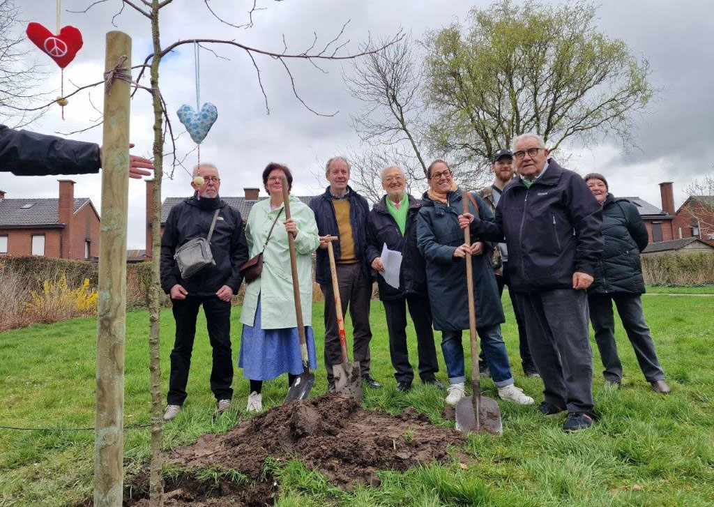 SINT-NIKLAAS. Onder ruime belangstelling is vanmorgen, zaterdag 16 maart 2024, in de groene zone tussen de Abingdon- en Gorinchemstraat een vredesboom geplant door Pax Christi Sint-Niklaas.  De boom werd opgefleurd met werkjes van bewoners van vzw De Klokke en WZC Gerda.