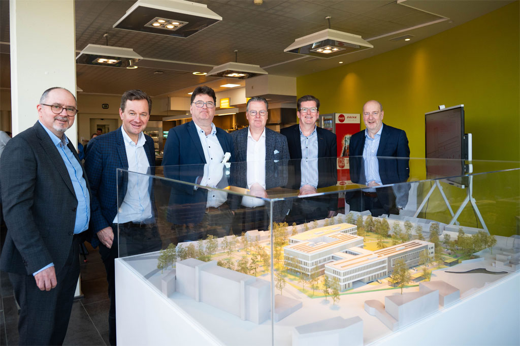 Het nieuwe ziekenhuis zal ook een stuk duurzamer zjin: geen mazout of gas meer. (mb, foto: vlnr: Henk Vincent (directeur nieuwbouw Vitaz), Stefan Van Den Brouck (algemeen directeur Vitaz), Filip Antheunis (burgemeester Lokeren), Koen Michiels (gedelegeerd bestuurder Vitaz), Gerry De Landtsheer (bestuurder Vitaz), Luc De Block (bestuurder Vitaz), © Vitaz)