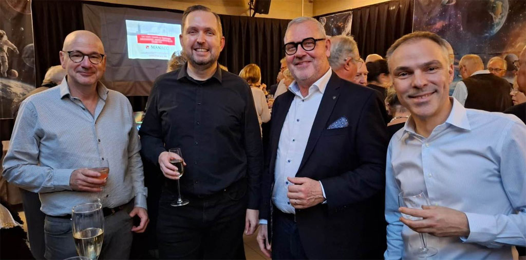 Onder de aanwezigen waren 182 leden van Neos, wat staat voor Netwerk voor Ondernemende Senioren of zeg maar gerust een jongerenclub voor 60-plussers. Dankzij een samenwerking van Harmonieorkest Beveren, Neos Beveren en Neos Sint-Gillis-Waas waren maar liefst vijf Neos-clubs uit het Waasland vertegenwoordigd. Alle aanwezige leden waren unaniem lovend over het spektakel dat ze te horen en te zien kregen. Velen kenden de rijke klankkleur van een harmonieorkest nog niet en waren diep onder de indruk van de totaalbeleving die hen werd geboden. "Dirk Foubert ontdekte het harmonieorkest enkele jaren geleden en wilde zo veel mogelijk leden van Neos de kans geven om deze muziek te leren kennen en waarderen. Daarin is hij met verve geslaagd. Dit smaakt naar meer!", klinkt het enthousiast. (mb, foto: vlnr: Gert D'haese (dirigent), Thomas Baert (voorzitter Harmonieorkest Beveren en regisseur), Dirk Foubert (Voorzitter van Neos Sint-Gillis-Waas), Stijn Ilsen (Ruimtegids), © Neos Sint-Gillis-Waas)