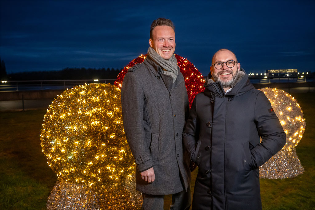 Temse Twinkelt loopt tot 4 januari 2026. (mb, foto: Schepen Bart Van Geyt en Unizo-voorzitter Stijn Teugels bij de verlichte kerstballen op de Wilfordkaai, © Joost Joossen)