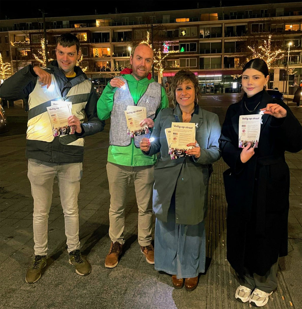 De wandeling, die startte aan het station, eindigde in het politiekantoor waar de groep flyers en witte lintjes uitdeelde aan de balie. Daar kreeg het gezelschap nog een tip mee: installeer de app 112 om sneller hulpdiensten te contacteren indien dat nodig zou zijn. (mb, foto: vlnr: Christophe Van Raemdonck (jong cd&v), Christophe Van Raemdonck (jong cd&v), Sara Weemaes (fractieleider + ondervoorzitster v&m), Emma Nersisyan (voorzitster v&m), © Sara Weemaes)