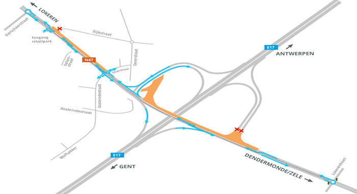 LOKEREN. Volgende week dinsdag, 18 april, starten de werken voor fase 1 de heraanleg van de N47. Na de avondspits zet de aannemer de signalisatie en markeringen klaar zodat op woensdagochtend 19 april voor de ochtendspits de nieuwe verkeerssituatie in voege kan treden. Daarbij gaan de op- en afrit van de E17 richting Antwerpen dicht.