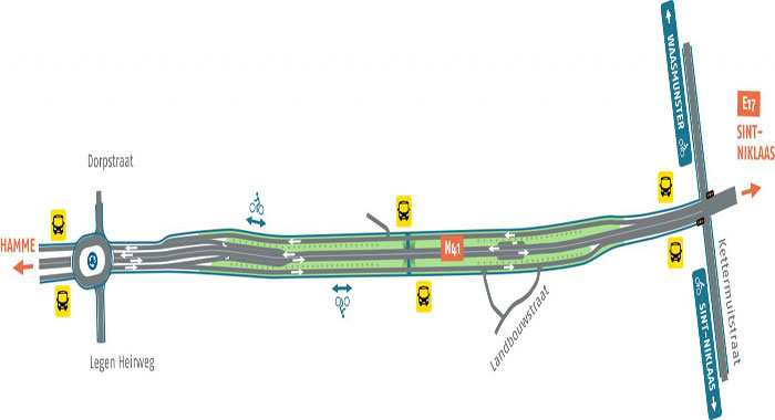 TEMSE. Maandag, 30 mei, start het Agentschap Wegen en Verkeer (AWV) met de herinrichting van de N41 tussen Steenweg Hulst-Lessen en de tunnel in de Dorpstraat in Temse. Er komen twee nieuwe ventwegen die parallel lopen met de N41, nieuwe dubbelrichtingfietspaden en een fietstunnel. Het verkeer op de N41 zal tijdens de werken bijna altijd mogelijk blijven.  De werken duren, afhankelijk van het weer, tot eind 2017.