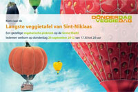 SINT-NIKLAAS. Sint-Niklaas zet ook dit jaar de schouders onder de campagne 'Donderdag Veggiedag', en campagne waarbij alle inwoners worden opgeroepen om één dag in de week eens geen vlees of vis, maar iets lekker vegetarisch als alternatief te eten. Morgen, donderdag 20 september, wordt de langste veggietafel van Sint-Niklaas op de Grote Markt gezet. Wie samen met een gelijkgezinden een vegetarisch gerecht wil eten, brengt zelf een veggie bereiding mee. Het initiatief, met 'gratis workshop Creatief met vegetarisch beleg', begint om 17.30 uur en duurt tot 20 uur.